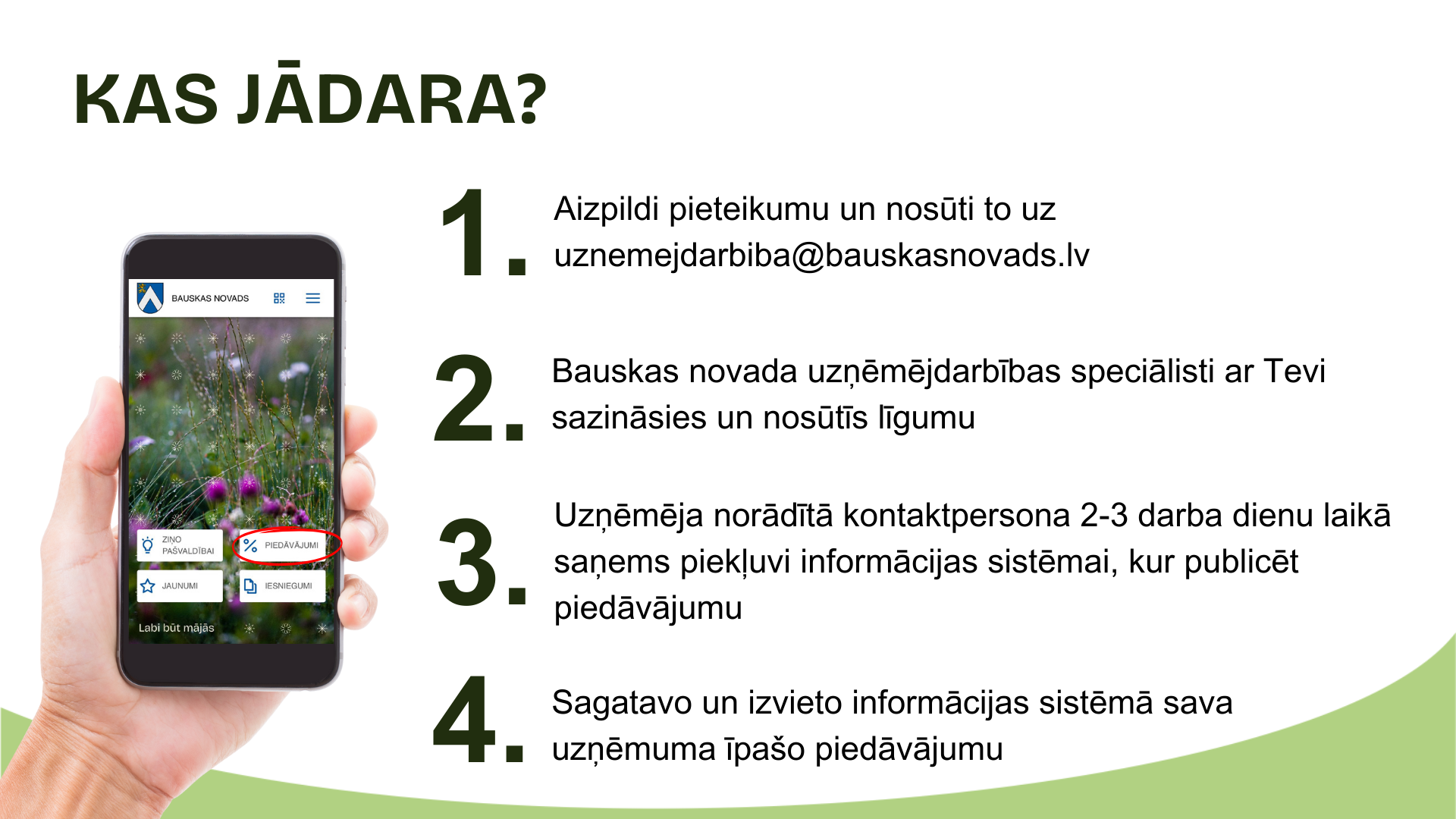 Bauskas novada mobilajā lietotnē ērtā veidā tu vari lasīt jaunumus, ziņot par problēmām, ērti pieteikties pašvaldības pakalpojumiem, saņemt izdevīgāk sadarbības partneru piedāvājumus un daudz ko citu.