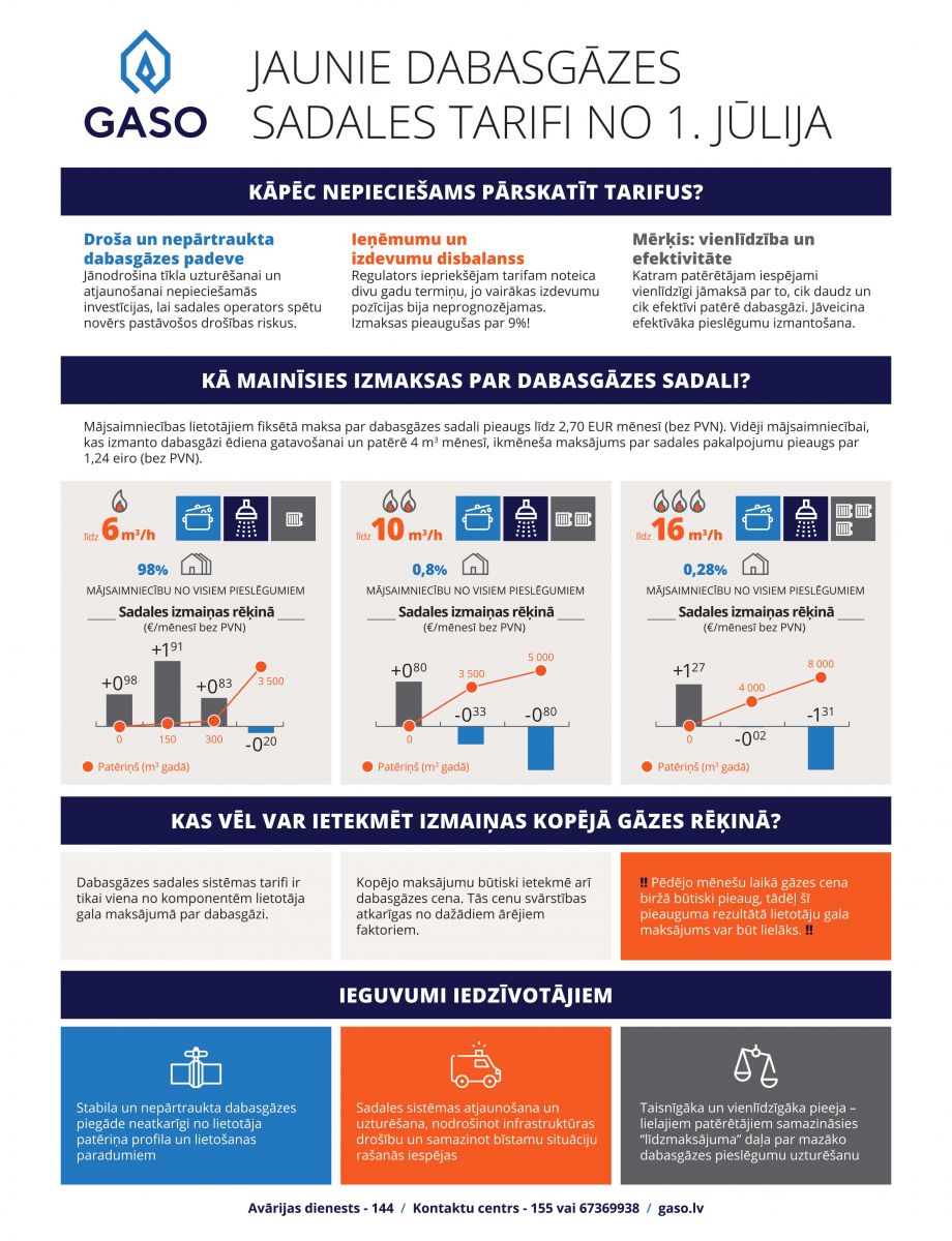 Vidēji mājsaimniecībai, kas patērē dabasgāzi ēdiena gatavošanai 4 m3 gāzes, ikmēneša rēķins pieaugs par 1,24 eiro (bez PVN). Mājsaimniecības, kas gāzi izmanto apkurei un patērē relatīvi vairāk – sākot no 210 m3 (100-120m2 platība) mēnesī, izmaksas nemainīsies vai nedaudz samazināsies. Pēc Gaso prognozēm, 2. tarifu grupas lietotājiem, kas dabasgāzi patērē apkures vajadzībām, vidējais maksājums par sadales pakalpojumu pieaugs tikai par 2,5 EUR gadā.