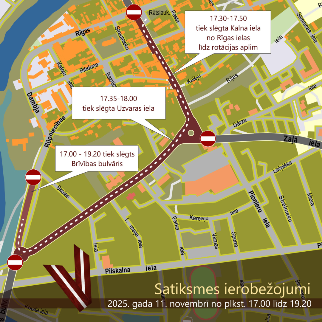 Vēršam uzmanību autovadītājiem, ka 11. novembrī no plkst. 17.00 līdz plkst. 19.20 tiks slēgts Brīvības bulvāris no Skolas ielas līdz Uzvaras ielas rotācijas aplim. Tāpat no plkst. 17.30 līdz plkst. 17.50 tiks slēgts Kalna ielas posms no Rīgas ielas līdz Kalna un Zaļās ielas rotācijas aplim. No plkst. 17.35 līdz plkst. 18.00 tiks slēgta satiksme Uzvaras ielas posmā no Kalna ielas rotācijas apļa līdz Uzvaras ielas rotācijas aplim.