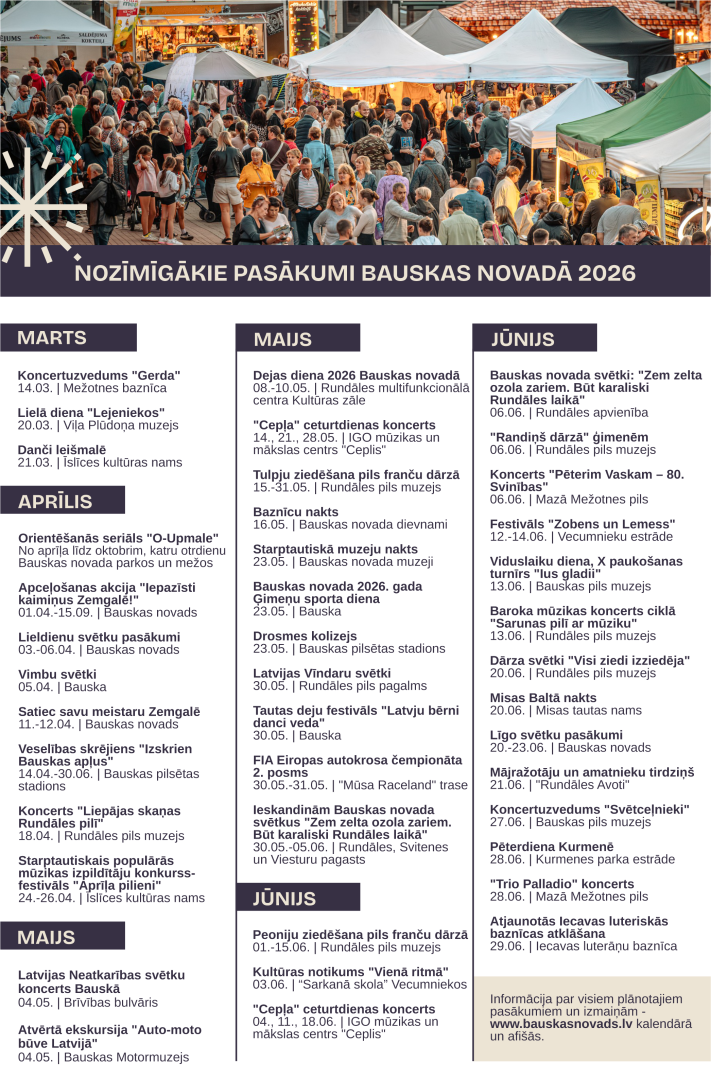 Aicinām iepazīties ar 2026. gada notikumiem un ieplānot pozitīvām emocijām piesātinātas atpūtas dienas Bauskas novadā!