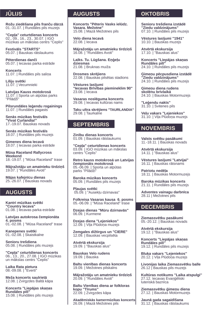 Aicinām sekot līdzi aktuālajai informācijai notikumu kalendārā: https://www.bauskasnovads.lv/lv/notikumu-kalendars, Tūrisma informācijas centra tīmekļvietnē: www.visit.bauska.lv, kā arī kultūras norišu organizatoru un tūrisma pakalpojumu sniedzēju tīmekļvietnēs.